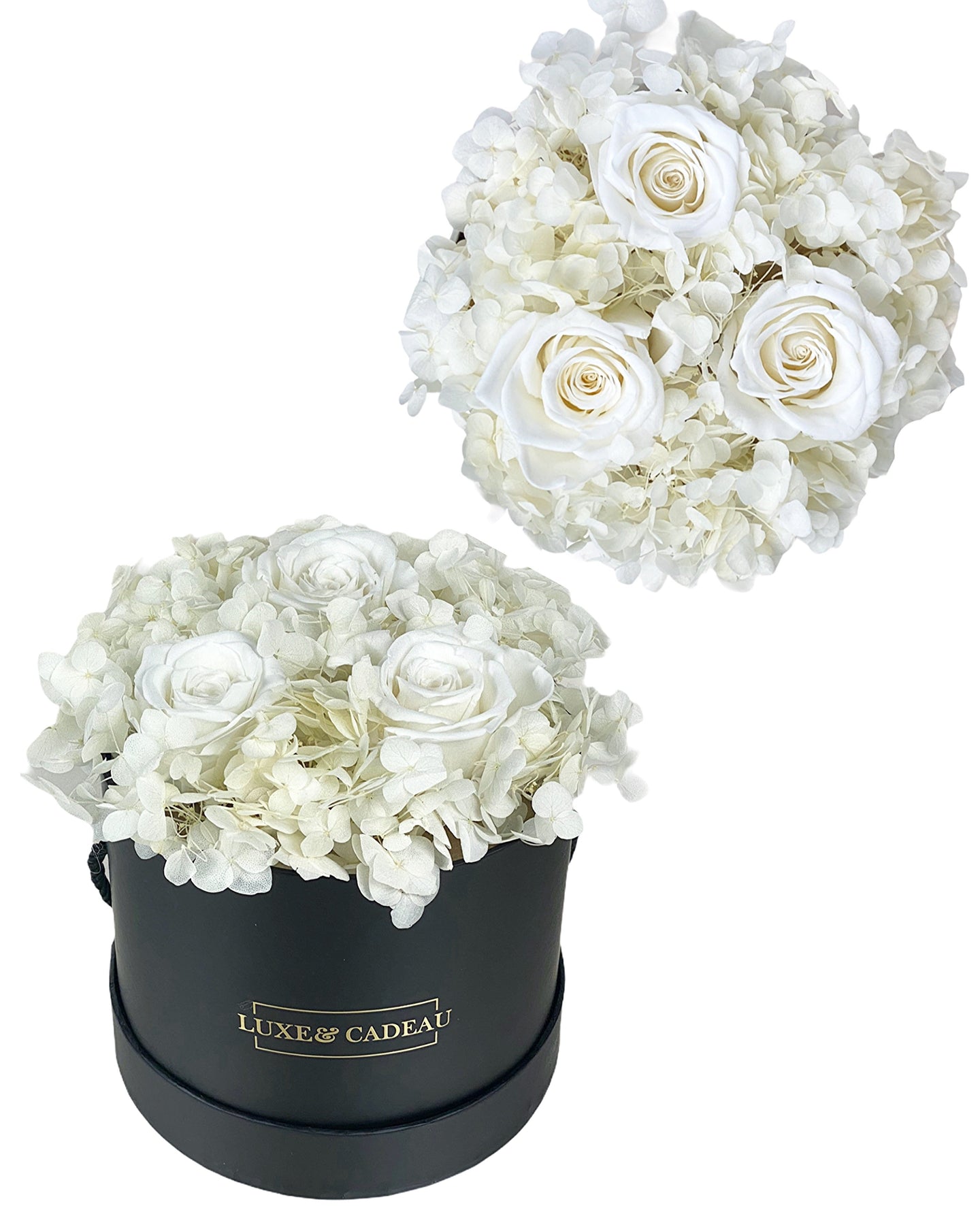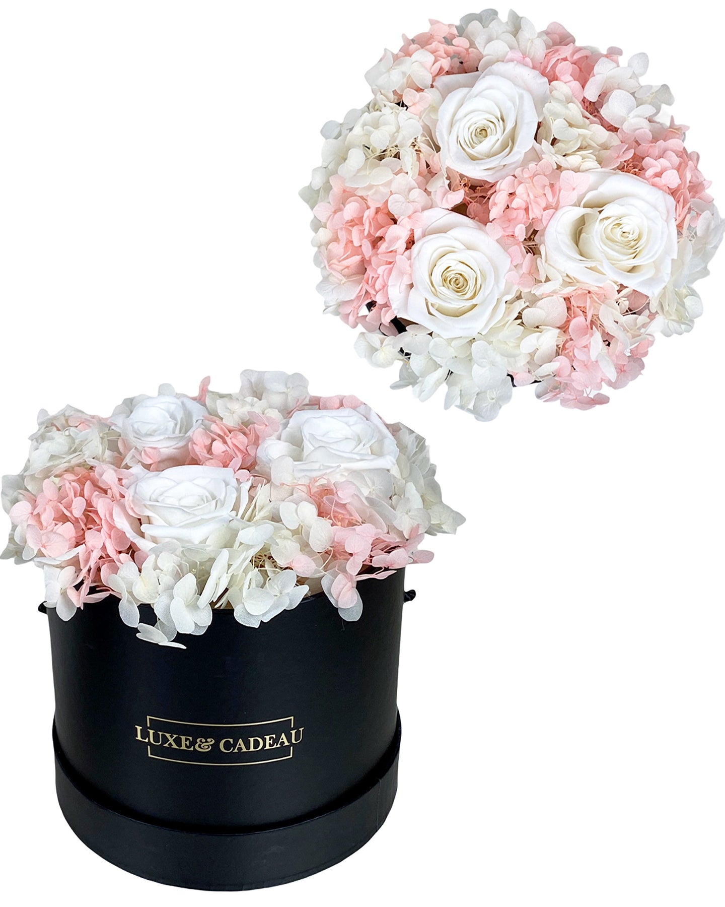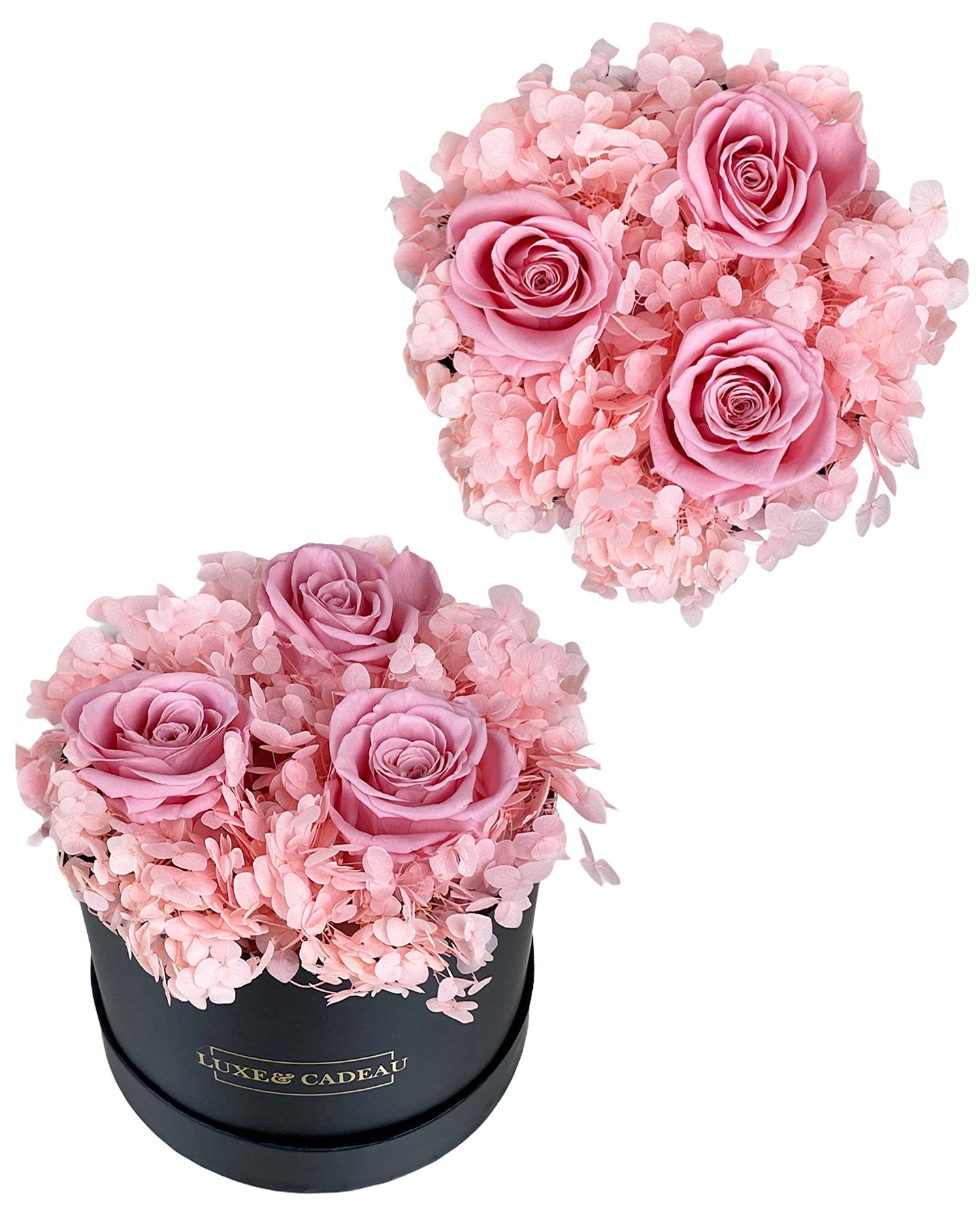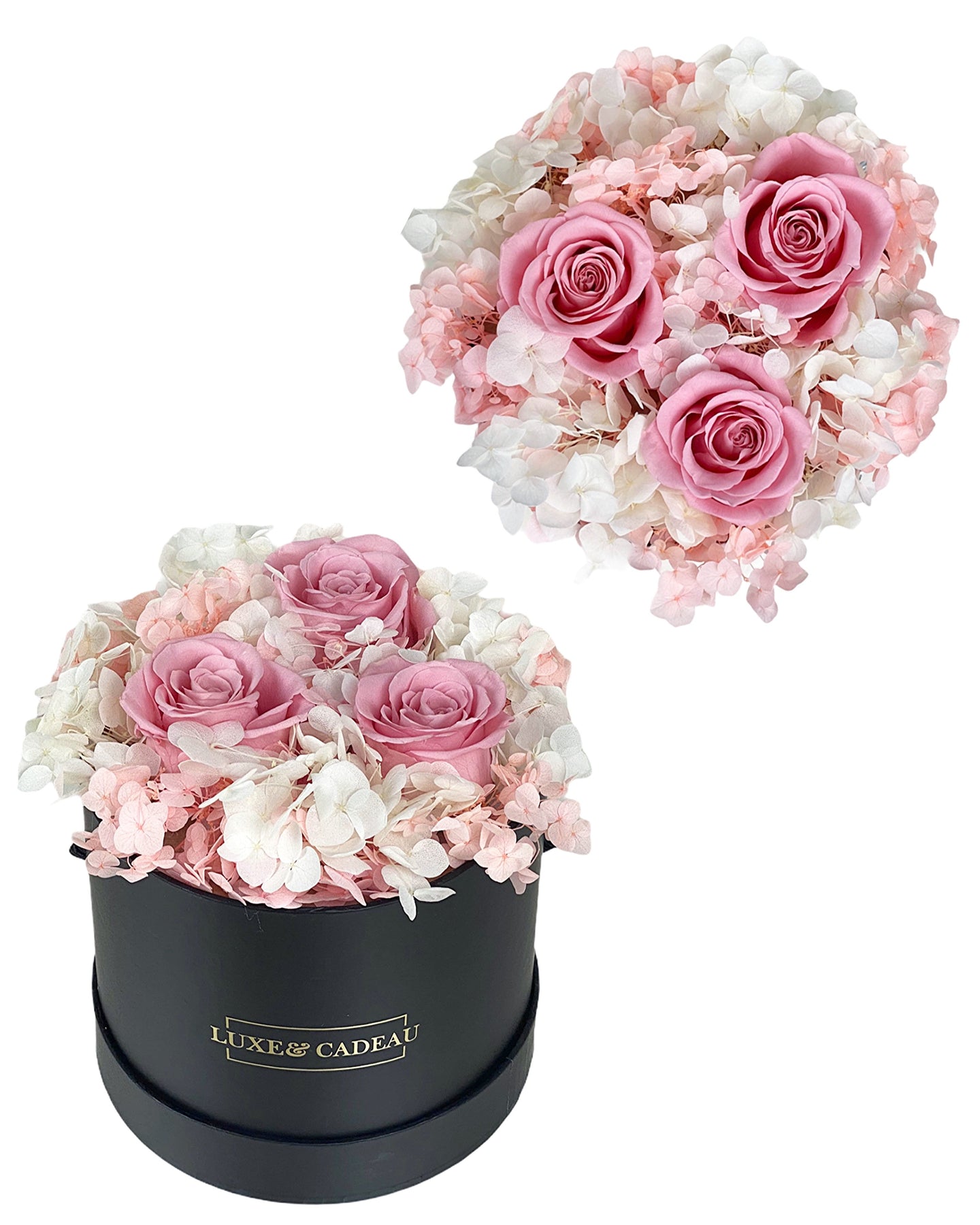 La composition est faite avec de vraies roses vivantes stabilisées.