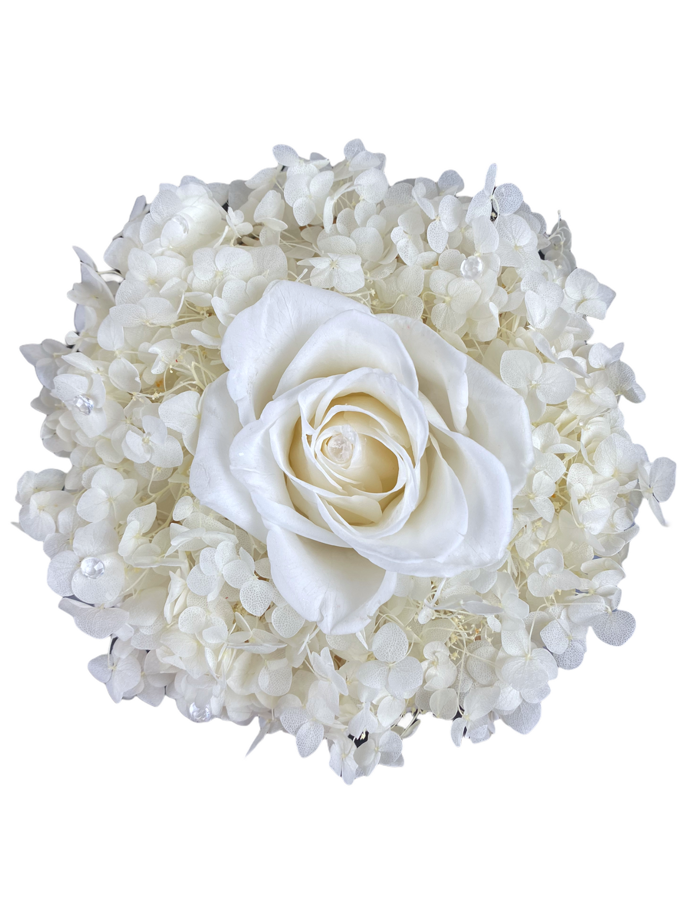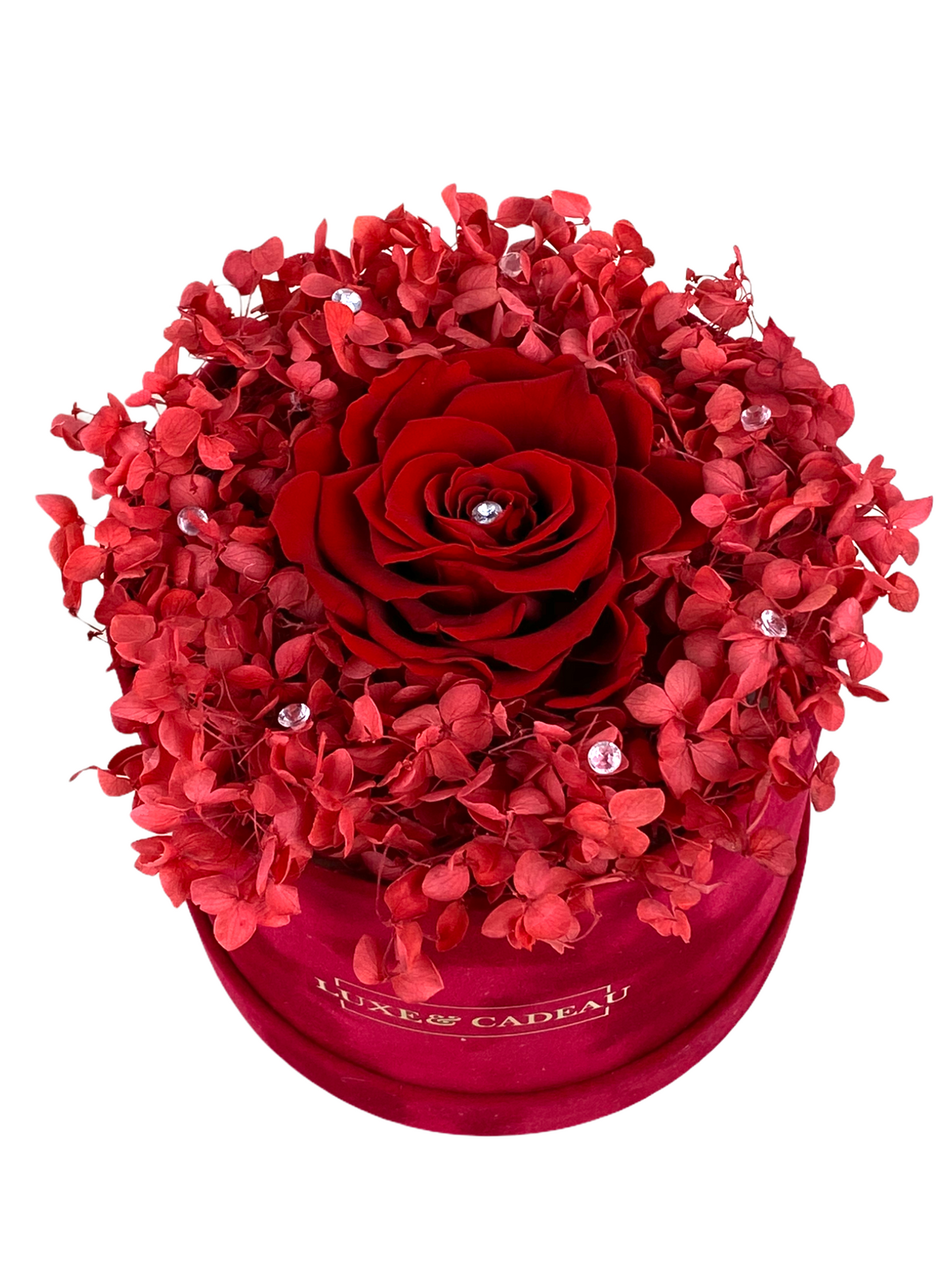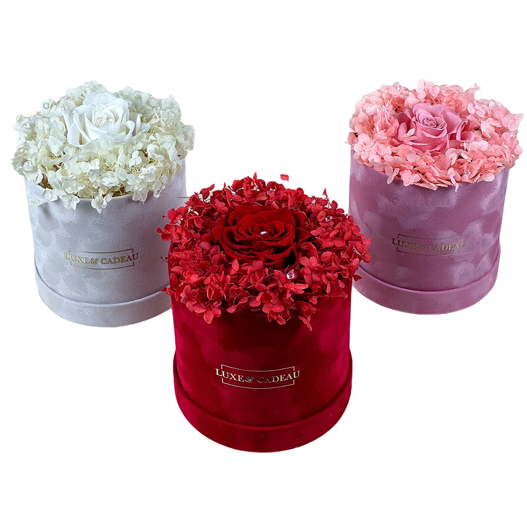 La composition est faite avec de vraies roses vivantes stabilisées.
