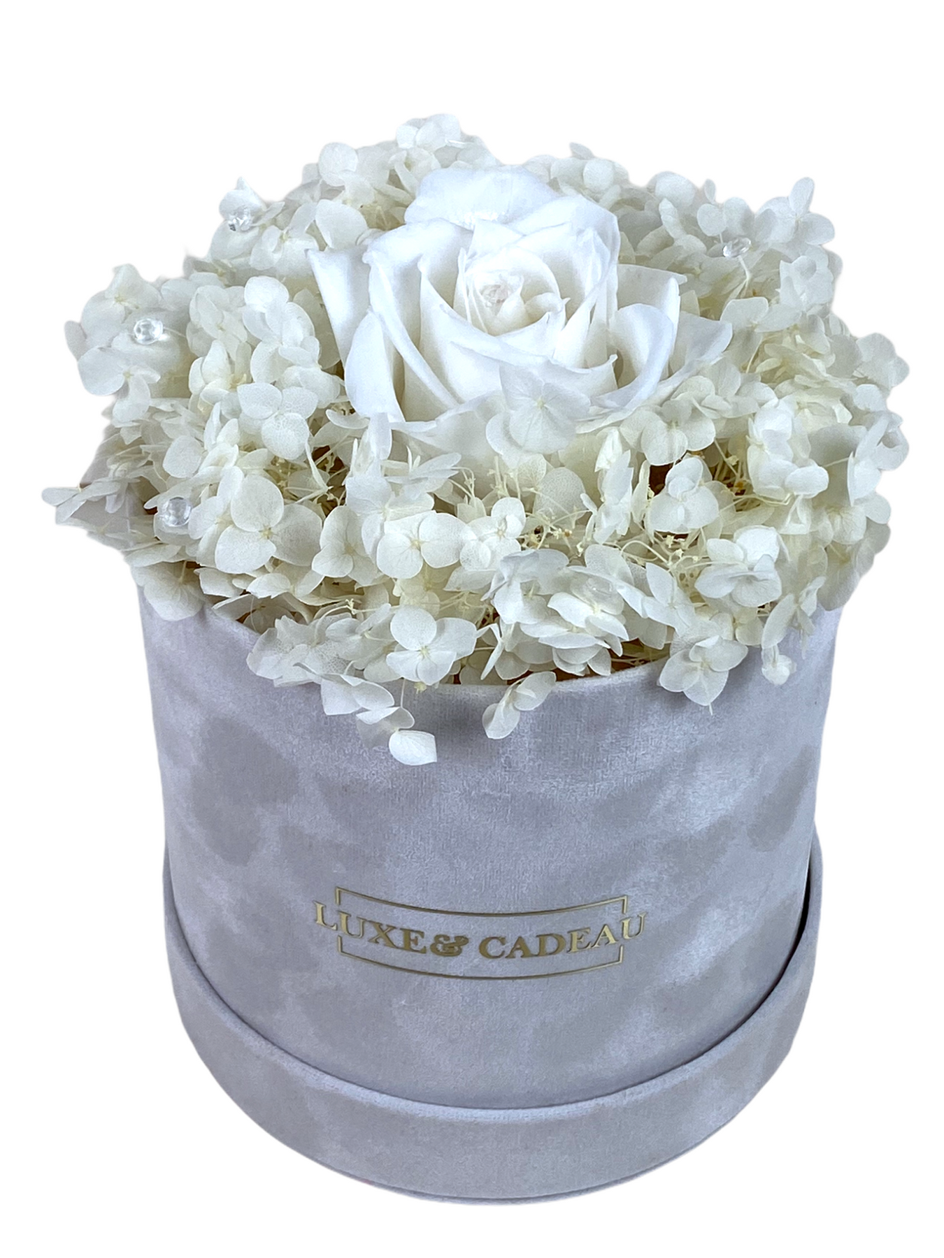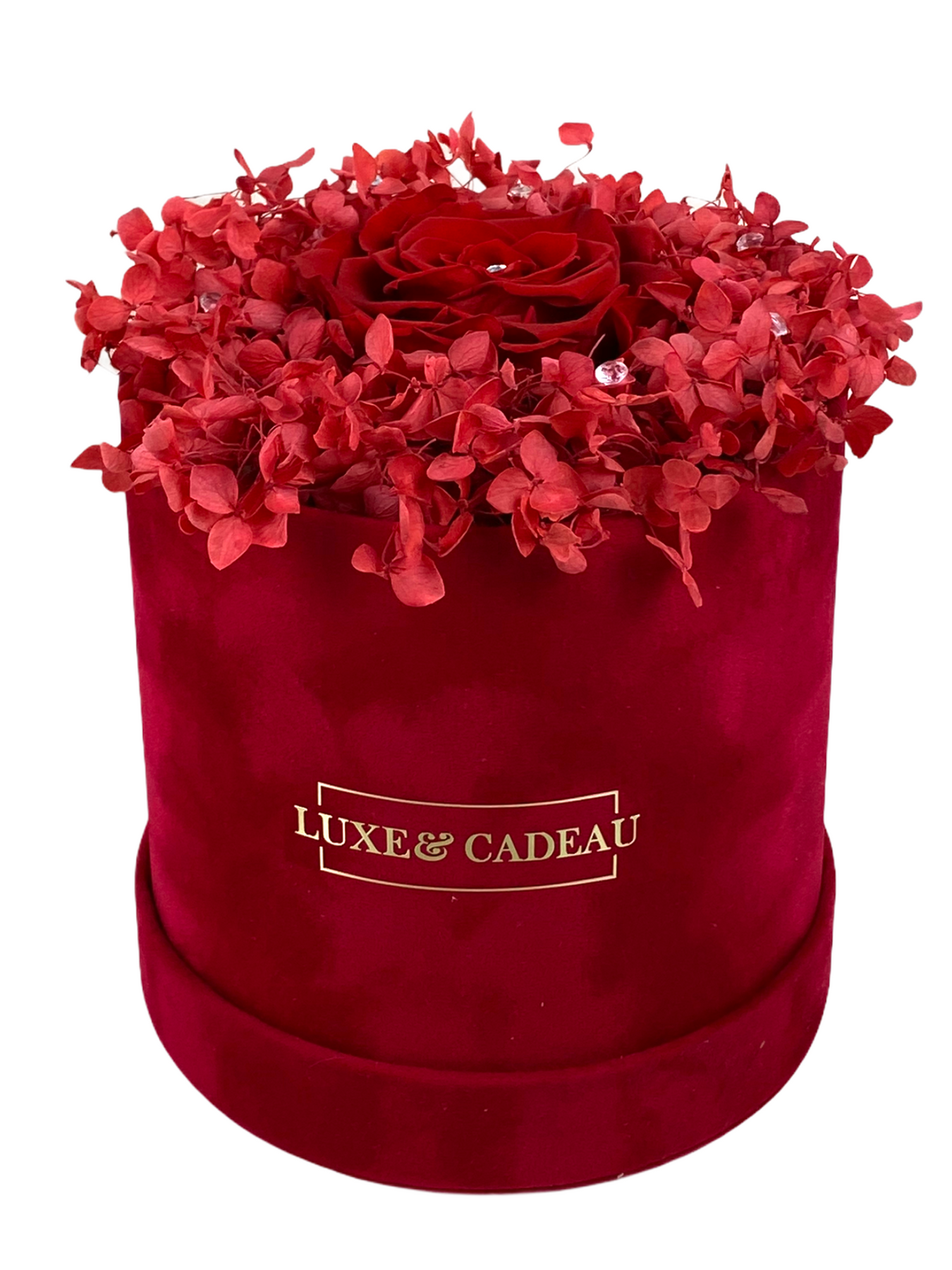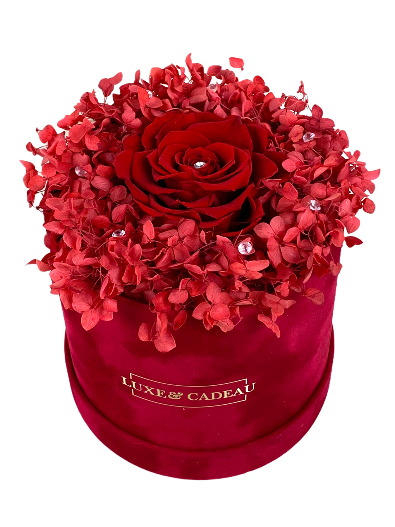 La composition est faite avec de vraies roses vivantes stabilisées.