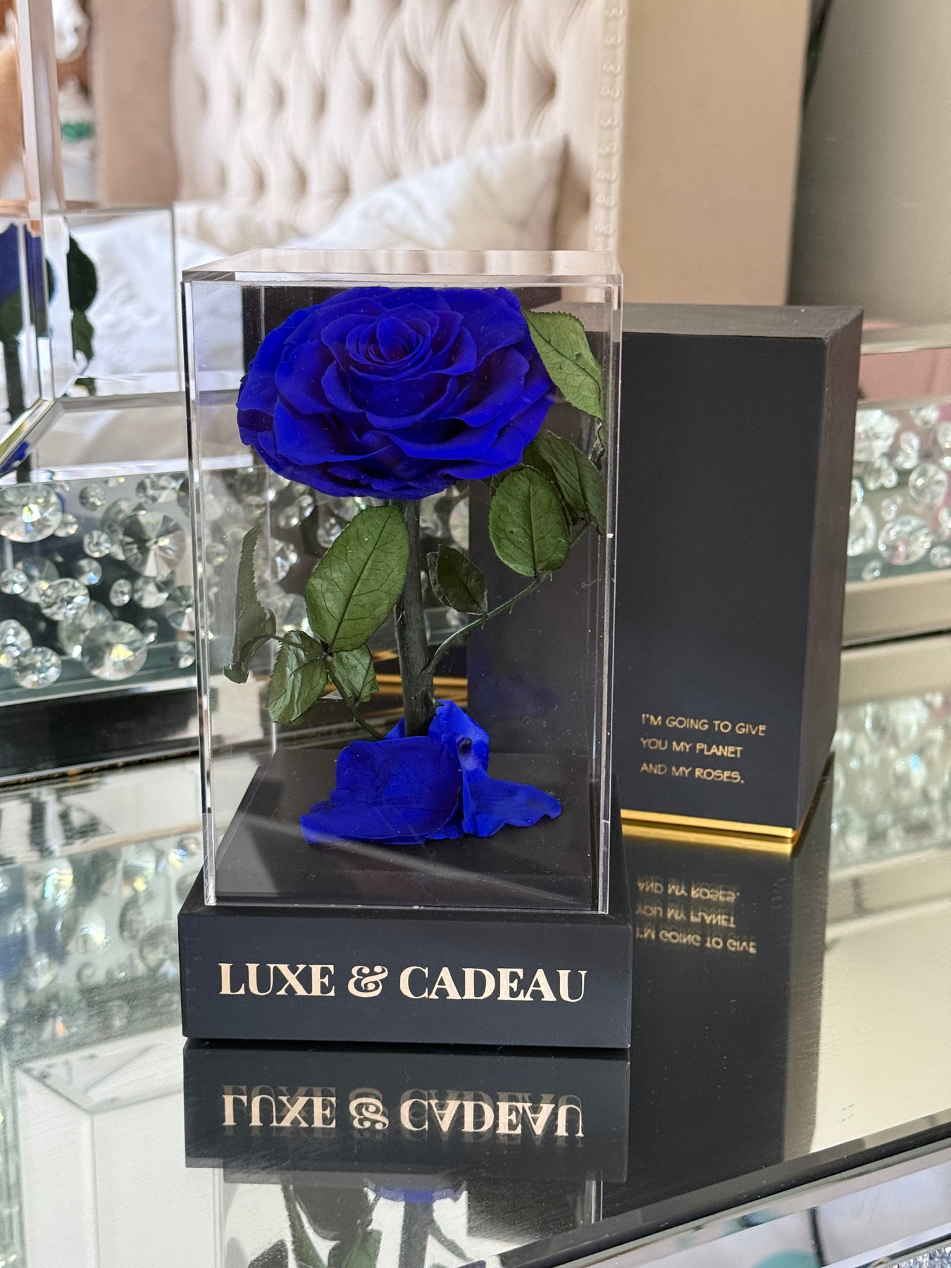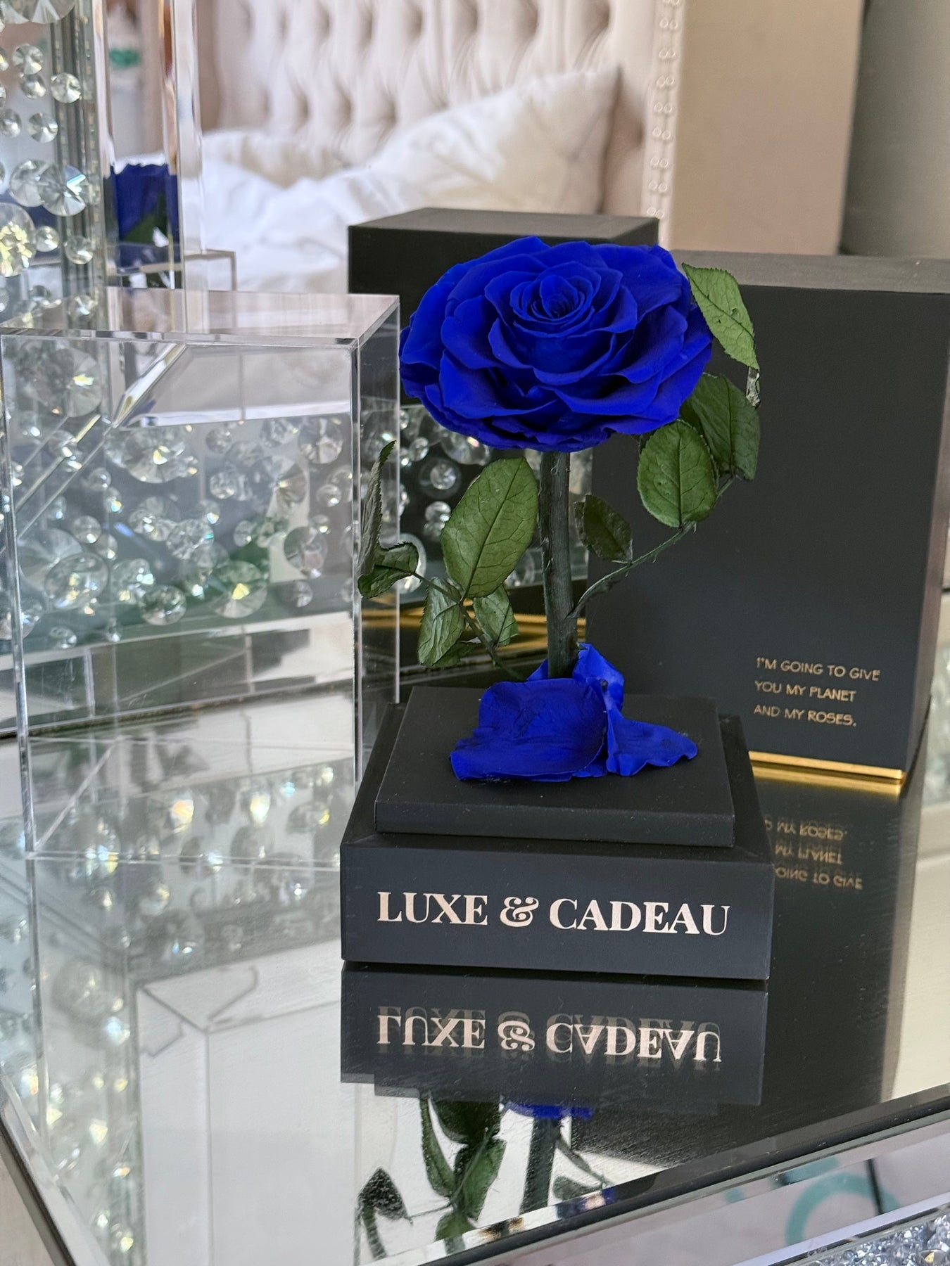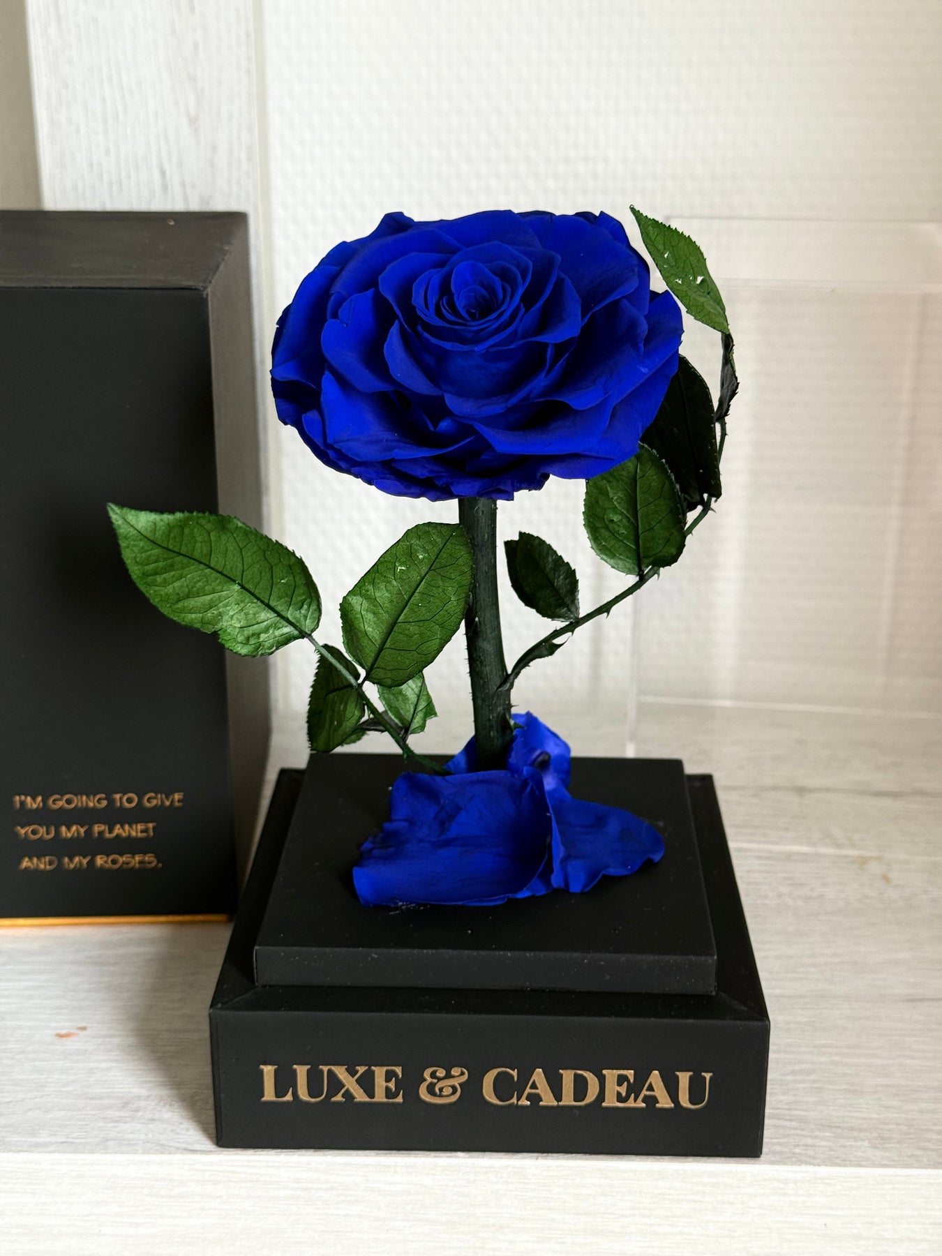 Découvrez une magnifique rose bleue éternelle, soigneusement conservée et présentée sous une élégante cloche transparente. Cette pièce raffinée est posée sur une base noire ornée du logo Luxe & Cadeau, ajoutant une touche de luxe intemporel à votre décoration. Parfaite comme cadeau ou pour embellir votre espace, cette rose est un symbole d’amour, de mystère et d’élégance.