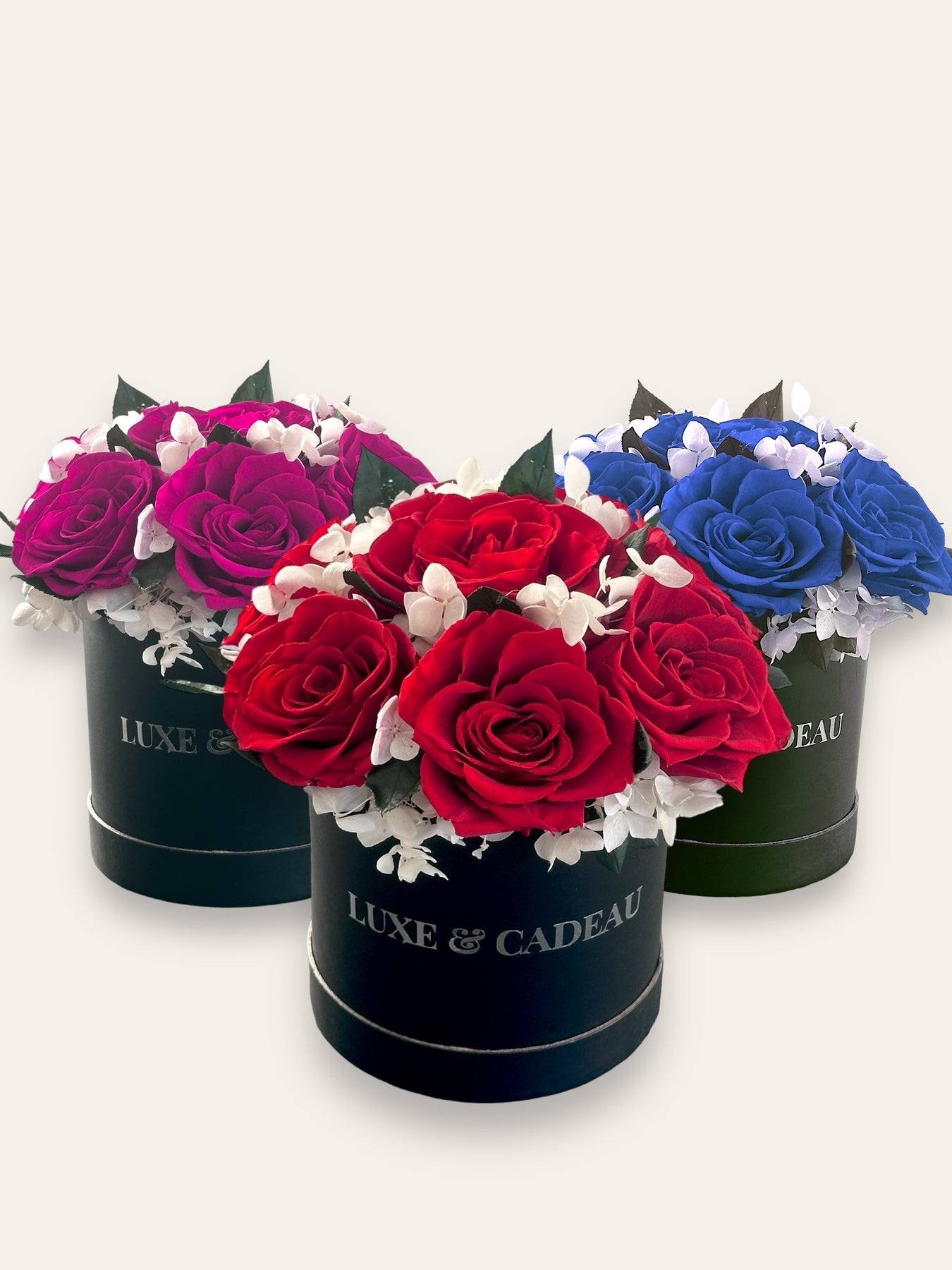 La composition est faite avec de vraies roses vivantes stabilisées.