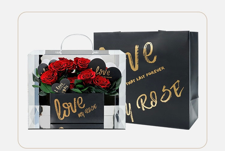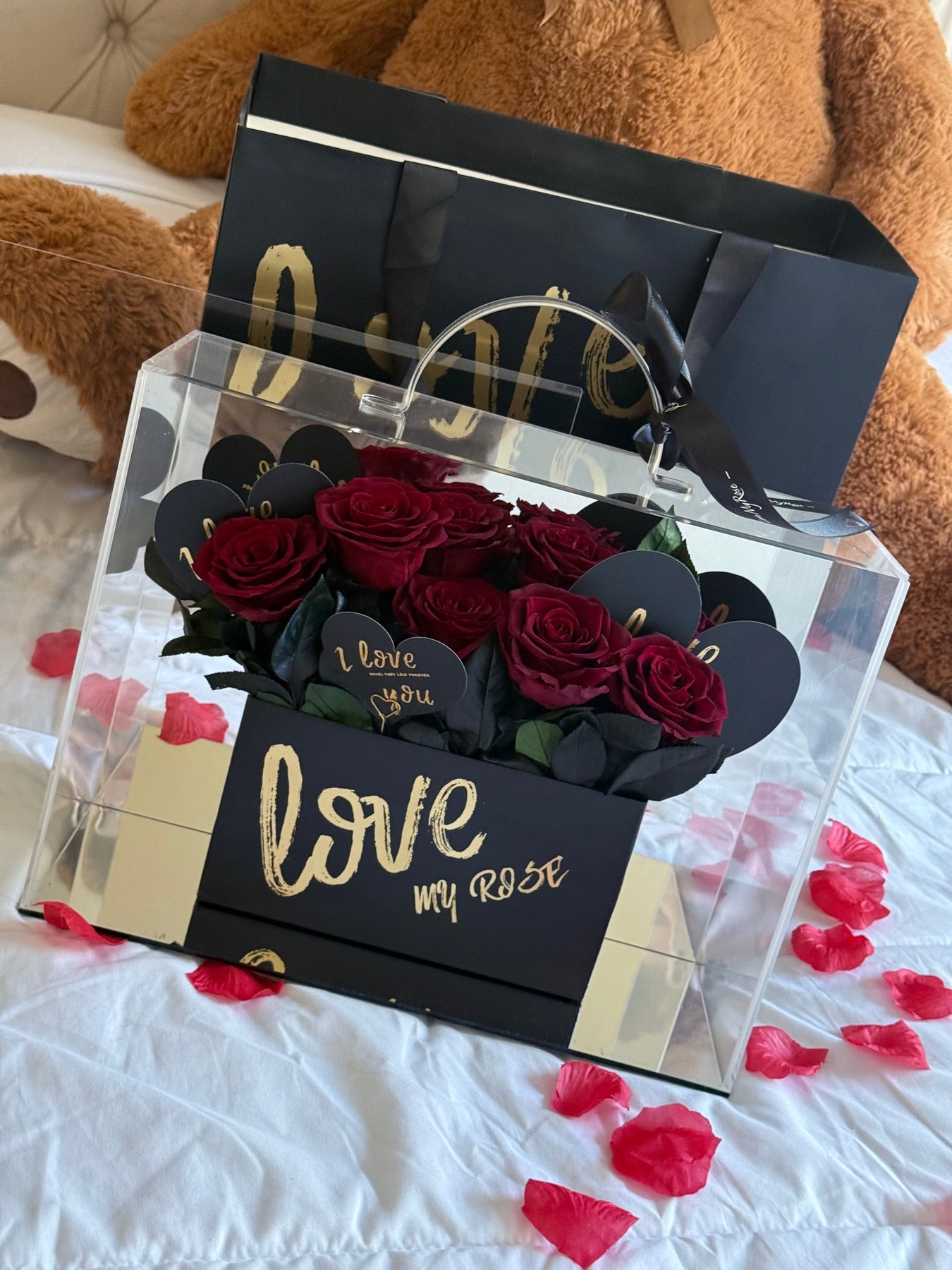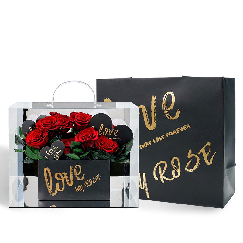 Le tout est accompagné d’un sac cadeau élégant avec l’inscription ‘Love My Rose’, faisant de cet ensemble un choix idéal pour exprimer vos sentiments les plus sincères et créer une impression inoubliable.