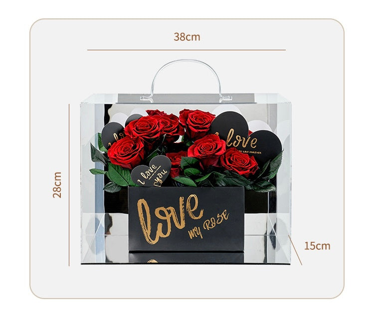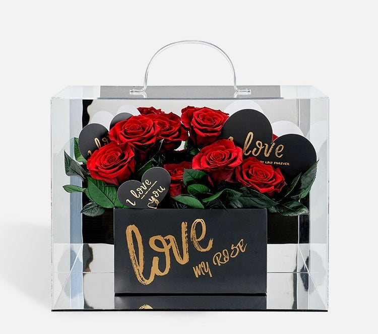 Un magnifique bouquet de 12 roses éternelles sur tige, présenté dans une élégante boîte ornée de l’inscription ‘Love’. La particularité de cette composition réside dans sa base miroir, qui apporte une profondeur et une touche de luxe unique.